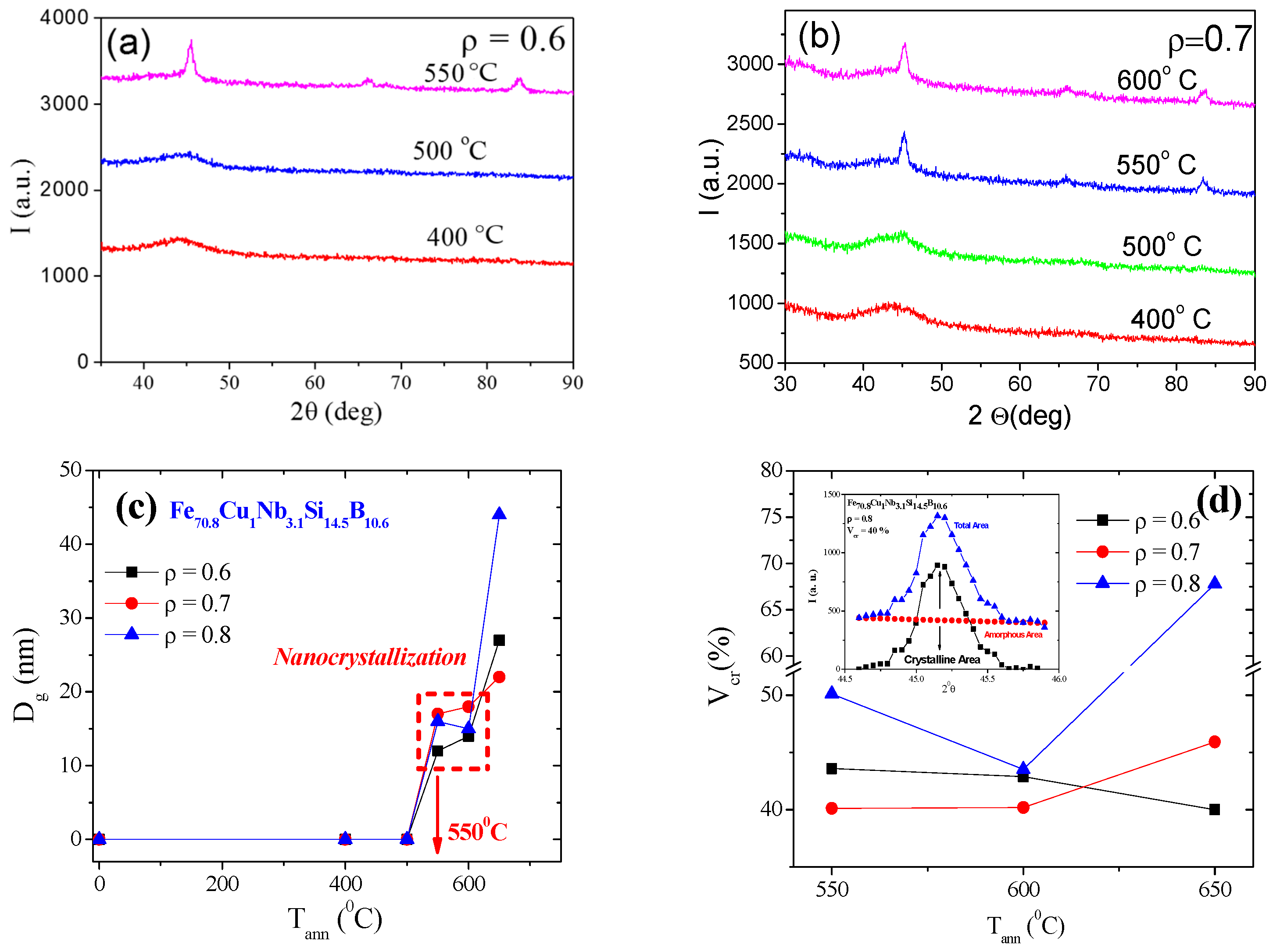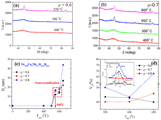 XRD patterns of annealed Fe70.8Cu1Nb3.1Si14.5B10.6 glass-coated microwires at Tann ranging between 400–600 °C for 1 h for ρ-ratio = 0.6 (a); ρ-ratio = 0.7 (b); grain size, Dg, dependence on Tann (c), and crystalline volume fraction Vcr dependence on Tann of Fe70.8Cu1Nb3.1Si14.5B10.6 microwires for different ρ-ratios (d). Inset of (d) shows the determination of Vcr from XRD crystalline peak of annealed Fe70.8Cu1Nb3.1Si14.5B10.6 at 650 °C with ρ-ratio = 0.8. Reproduced from reference [47], Figure 3.