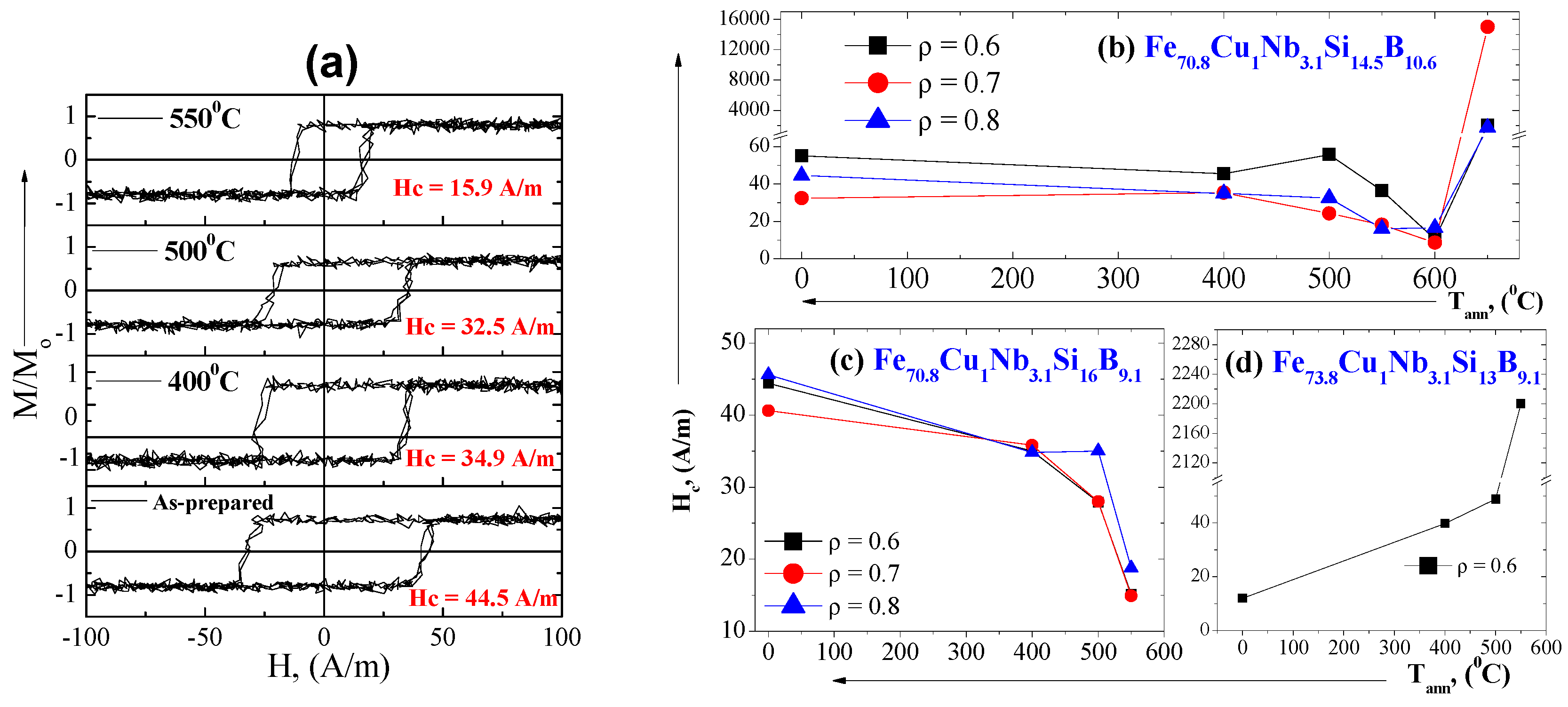 Hysteresis loops of as-prepared and annealed Fe70.8Cu1Nb3.1Si14.5B10.6 microwire at Tann ranging between 400 and 600 °C (a); coercivity dependence on Tann of Fe70.8Cu1Nb3.1Si14.5B10.6 for different ρ-ratios (b); Hc dependence on Tann of Fe70.8Cu1Nb3.1Si16B9.1 microwires for different ρ-ratios (c); and of Fe73.8Cu1Nb3.1Si13B9.1 for ρ-ratio = 0.6 (d). Reproduced from reference [47], Figure 4.