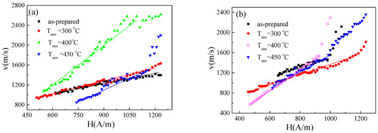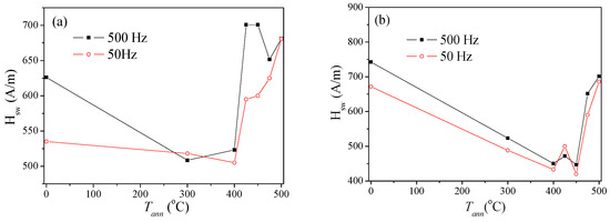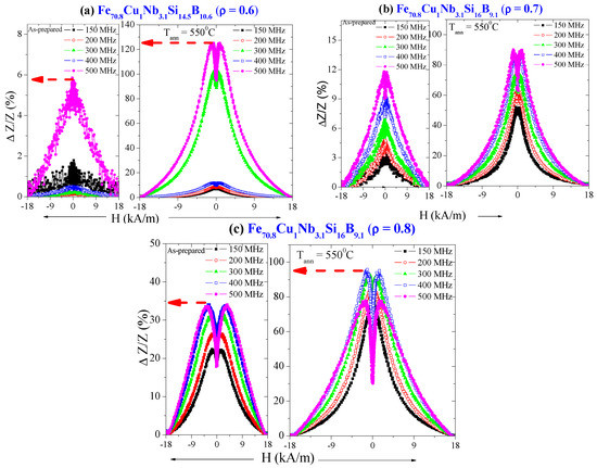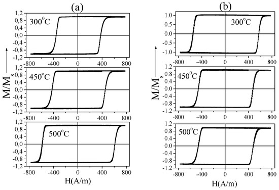 Figure 7a presents hysteresis loops of as-prepared and annealed Fe70.8Cu1Nb3.1Si14.5B10.6 microwire samples for ρ-ratio = 0.8. A rectangular character of hysteresis loops for as-prepared and annealed microwires is observed. As can be deduced from Figure 7a,b, the coercivity, Hc, decreases with annealing temperature increasing (Hc decreases from 44.5 A/m for as-prepared amorphous microwire to 15.9 A/m for the one annealed at Tann = 550 °C).