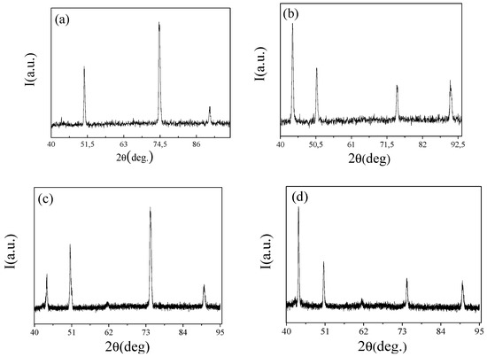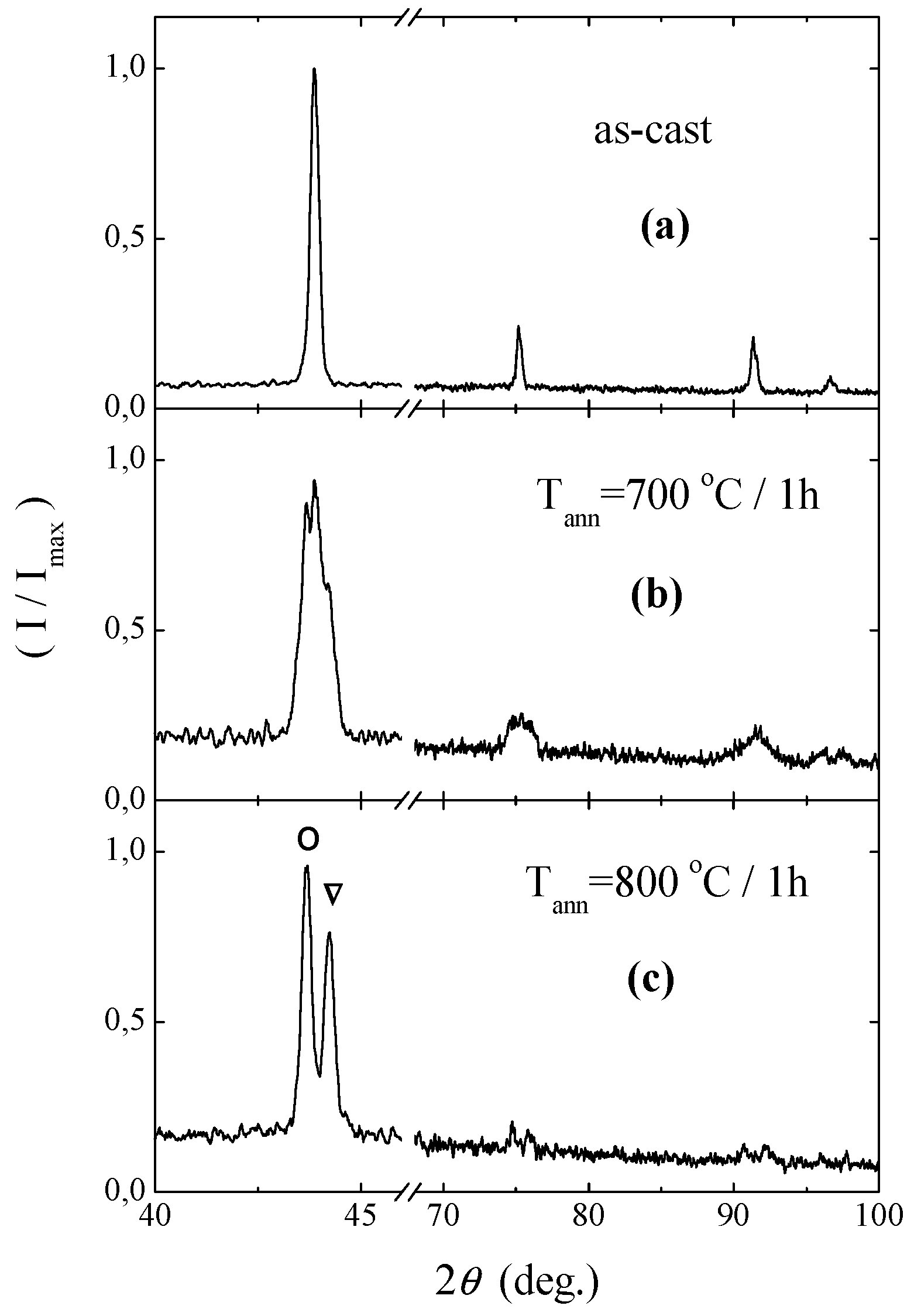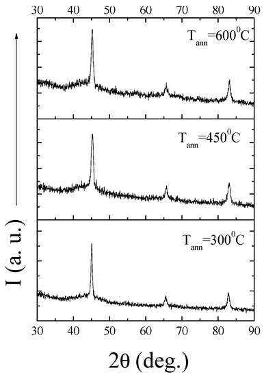 XRD patterns of the three as-prepared aforementioned Finemet glass-coated microwires are shown in Figure 5. Fe70.8Cu1Nb3.1Si16B9.1 and Fe70.8Cu1Nb3.1Si14.5B10.6 present wide diffuse amorphous halos typical for the amorphous structure (Figure 5a,b). Nevertheless, for Fe73.8Cu1Nb3.1Si13B9.1 a main crystalline peak appears at a diffraction angle of about 2Ө ≈ 45° corresponding to BCC α-Fe-Si crystallites [57]. Analyzing this peak features (maximum position and width), the crystalline grain size diameter, Dg, can be easily estimated beyond the well-established Debye-Scherrer formula [58]: