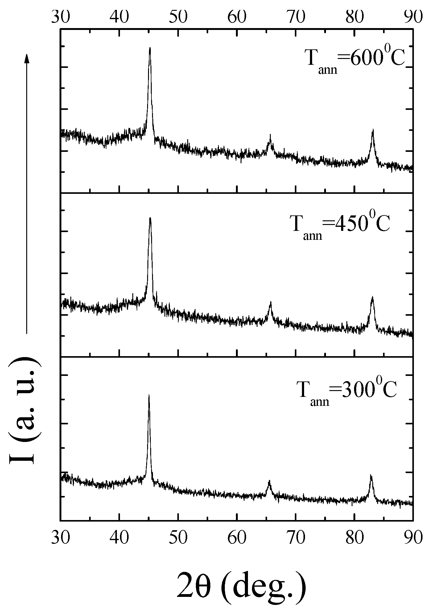 To achieve the nanocrystallization of microwires exhibiting amorphous structure in as-prepared state, we annealed them at annealing temperature, Tann, ranging between 400–650 °C for 1 h. XRD patterns of annealed Finemet samples are visible in Figure 6a,b. The devitrification process of Fe70.8Cu1Nb3.1Si14.5B10.6 (with ρ-ratio = 0.6 and 0.7) starts at 500 °C, where a noticeable crystalline peak grows up (Figure 6). Similarly to the as-prepared Fe73.8Cu1Nb3.1Si13B9.1, a BCC α-Fe-Si crystalline peak appears at a diffraction angle about 45° by reaching Tann = 550 °C. By increasing the annealing temperature such peak becomes higher and narrower indicating an increase in the grain size, and the crystalline volume fraction, respectively. The average grain size, Dg, (evaluated using equation (4)) for each Fe70.8Cu1Nb3.1Si14.5B10.6 microwires is between 12 and 17 nm in the range of 550 °C ≤ Tann ≤ 600 °C and rapidly increases at Tann ≥ 650 °C reaching a value about 40 nm (Figure 6c).
