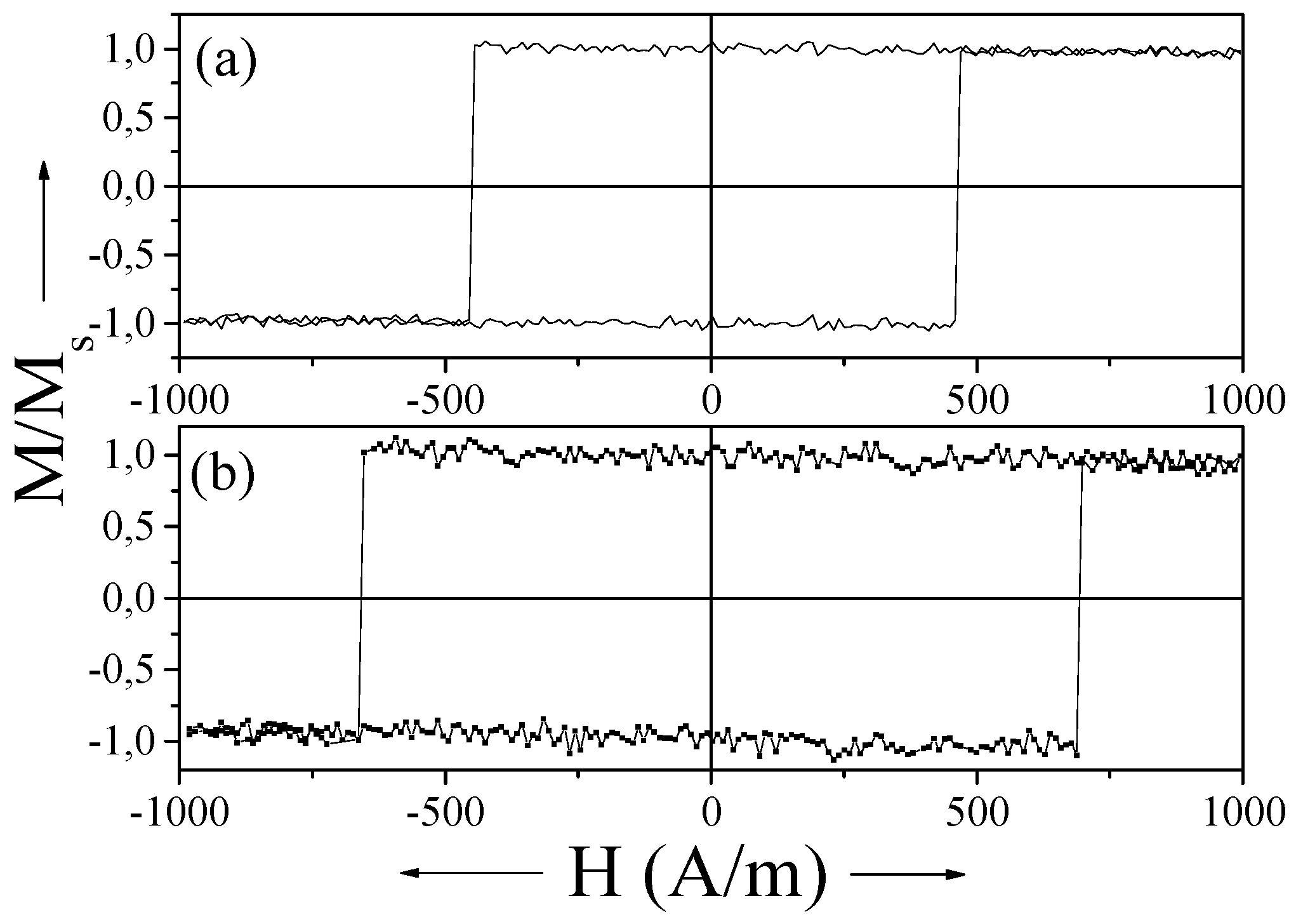 - Wang, K.-Y.; Arcas, J.; Larin, V.; Muñoz, J.L.; Zhukov, A.P.; Chen, D.-X.; Vázquez, M.; Hernando, A. Glass-coated Fe-Ni-Cu microwires with high coercivity. Phys. Stat. Solidi A 1997, 162, R5. [Google Scholar] [CrossRef]