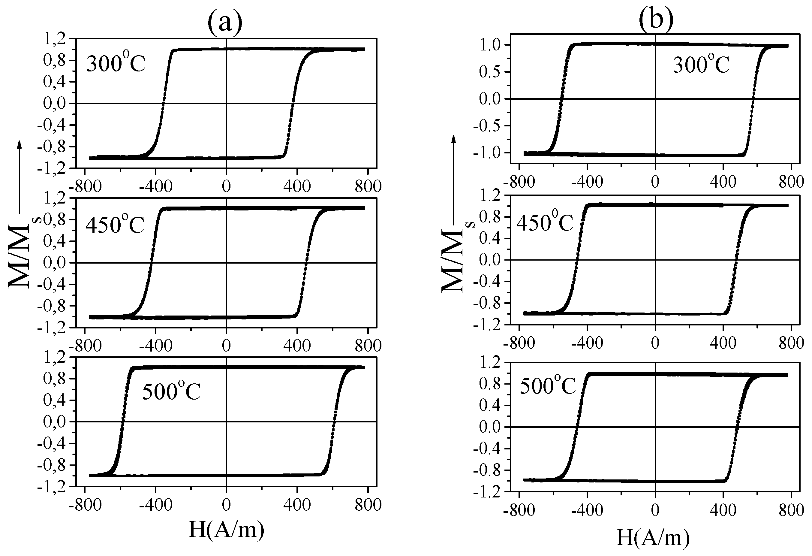 - Gonzalez, J.; Zhukov, A.; Zhukova, V.; Cobeño, A.F.; Blanco, J.M.; de Arellano-Lopez, A.R.; Lopez-Pombero, S.; Martinez-Fernandez, J.; Larin, V.; Torcunov, A. High coercivity of partially devitrified glass-coated finemet microwires: Effect of geometry and thermal treatment. IEEE Trans. Magn. 2000, 36, 3015–3017. [Google Scholar] [CrossRef]