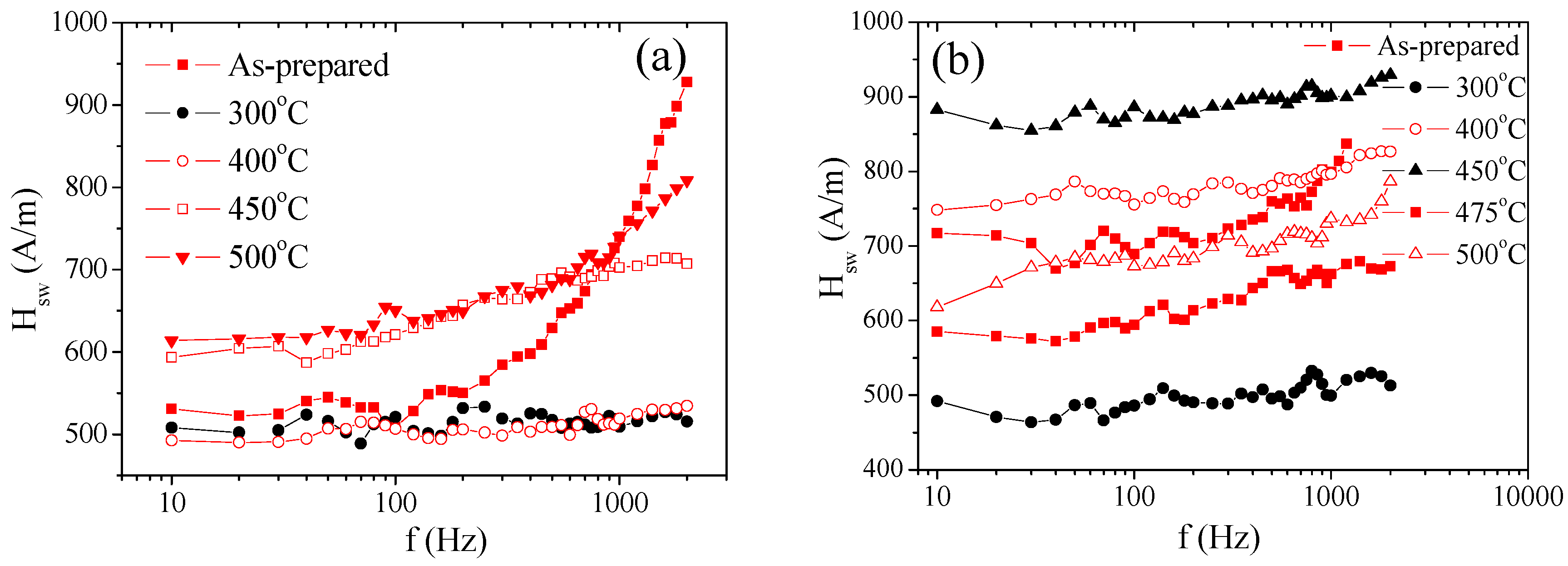 - Zhukov, A.; Vázquez, M.; Velázquez, J.; Garcia, C.; Valenzuela, R.; Ponomarev, B. Frequency dependence of coercivity in rapidly quenched amorphous materials. J. Mater. Sci. Eng. A 1997, 226–228, 753–756. [Google Scholar] [CrossRef]