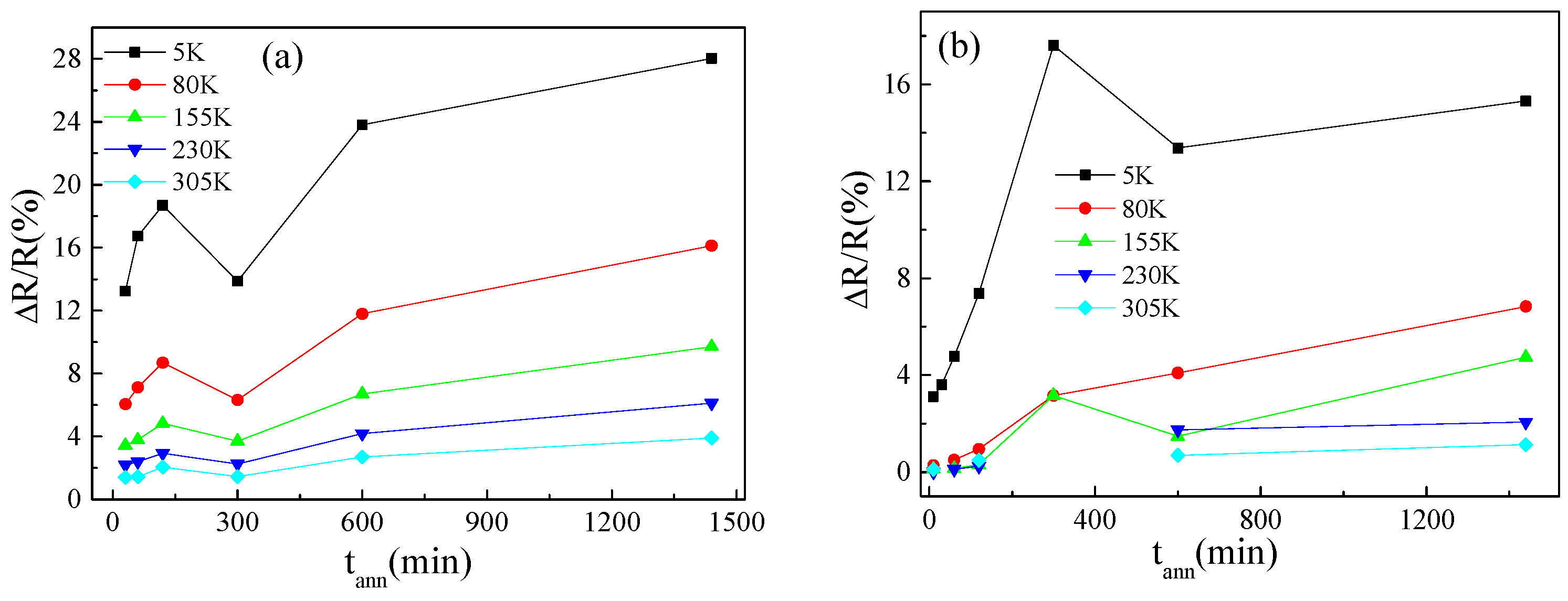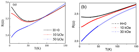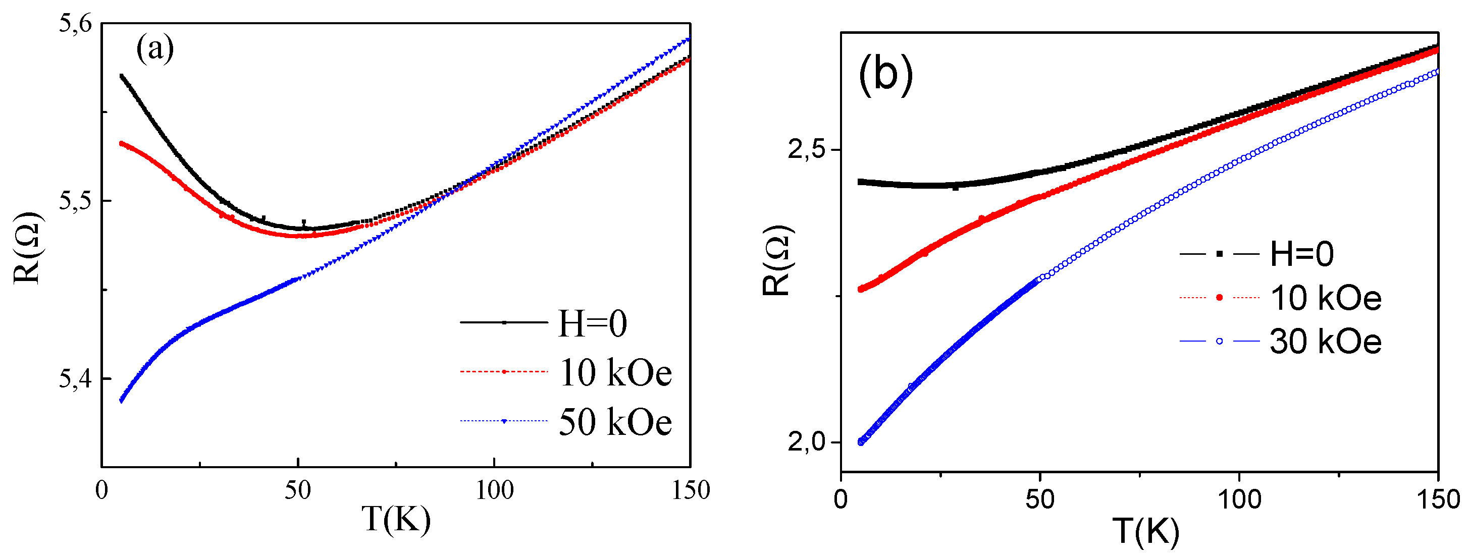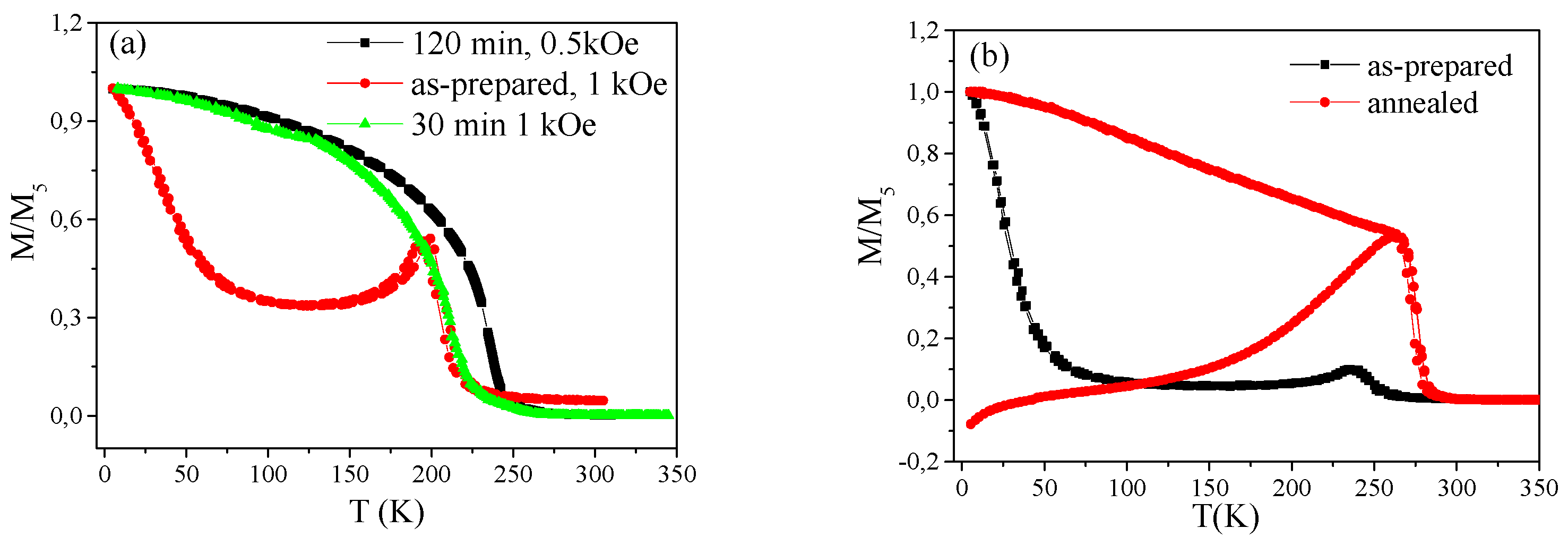 - Wang, B.M.; Wang, L.; Liu, Y.; Zhao, B.C.; Zhao, Y.; Yang, Y.; Zhang, H. Strong thermal-history-dependent magnetoresistance behavior in Ni49.5Mn34.5In16. J. Appl. Phys. 2009, 106, 063909. [Google Scholar] [CrossRef]