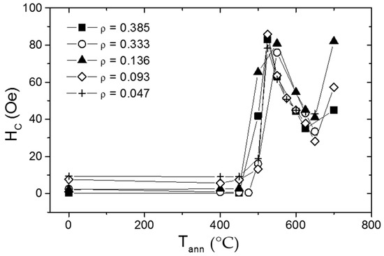 The coercivity dependence on annealing temperature of Fe70.8Cu1Nb3.1Si14.5B10.6 microwires for different ρ-ratios is shown in Figure 7b. The optimal soft magnetic behavior with coercivities values down to 10 A/m is obtained for Tann = 600ºC (Figure 7b). A similar tendency has been also observed for Fe70.8Cu1Nb3.1Si16B9.1 Finemet microwires with different ρ-ratios (Figure 7c) for Tann ≤ 550 °C. Further increasing of the annealing temperature for Fe73.8Cu1Nb3.1Si13B9.1 led to an abrupt increase of the coercivity up to 2200 A/m and deterioration of magnetic softness (Figure 7d). An increase in the coercive field is also observed for Fe70.8Cu1Nb3.1Si14.5B10.6 microwires treated at Tann = 650 °C (Figure 7b), being usually associated to the precipitation of Fe2B phase and a noticeable magnetic hardening [64].