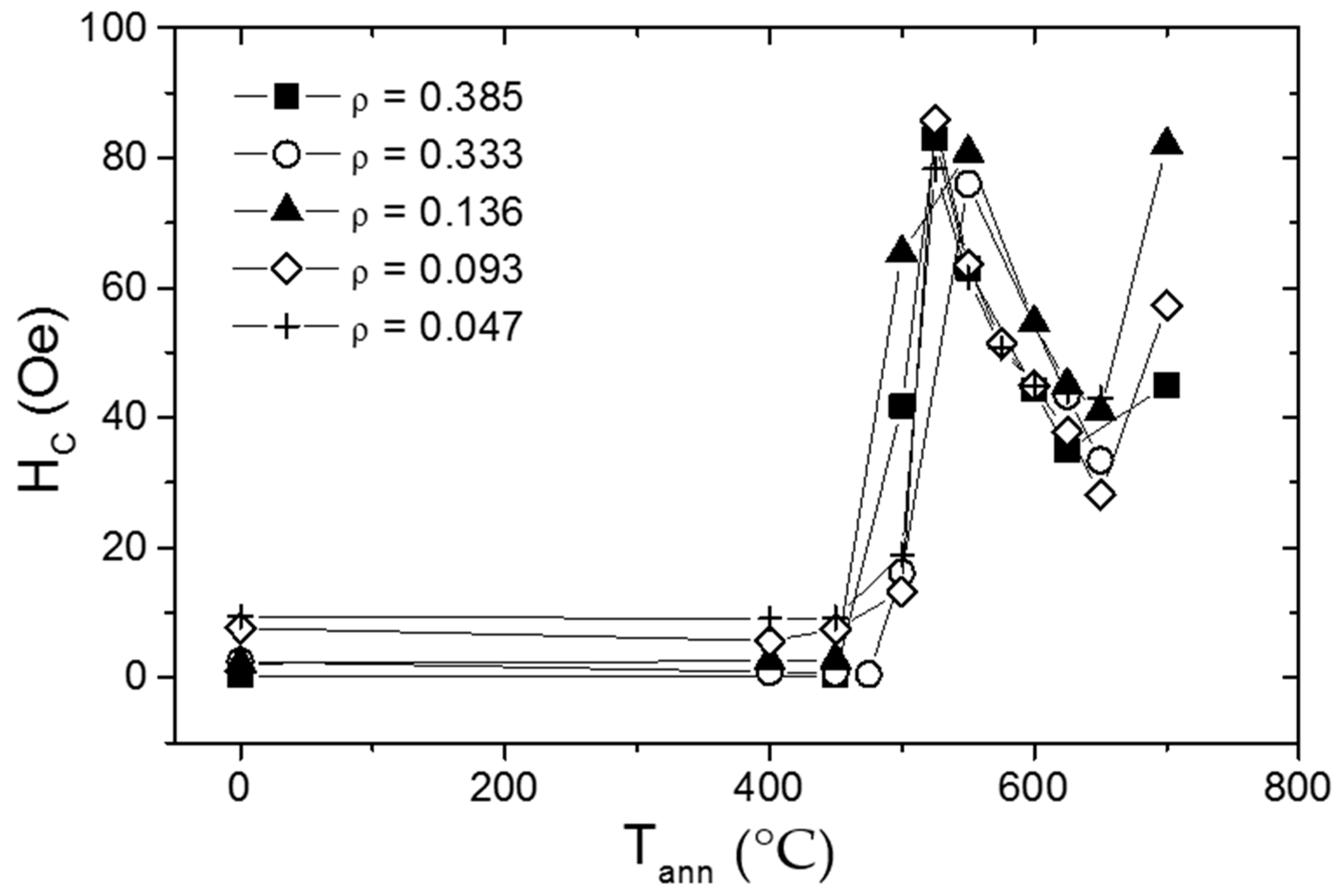 The magnetoelastic anisotropy gives rise to different values of coercive fields as it is evidenced from the dependence of coercivity and hysteresis loops on ρ-ratio represented in Figure 4a,b.