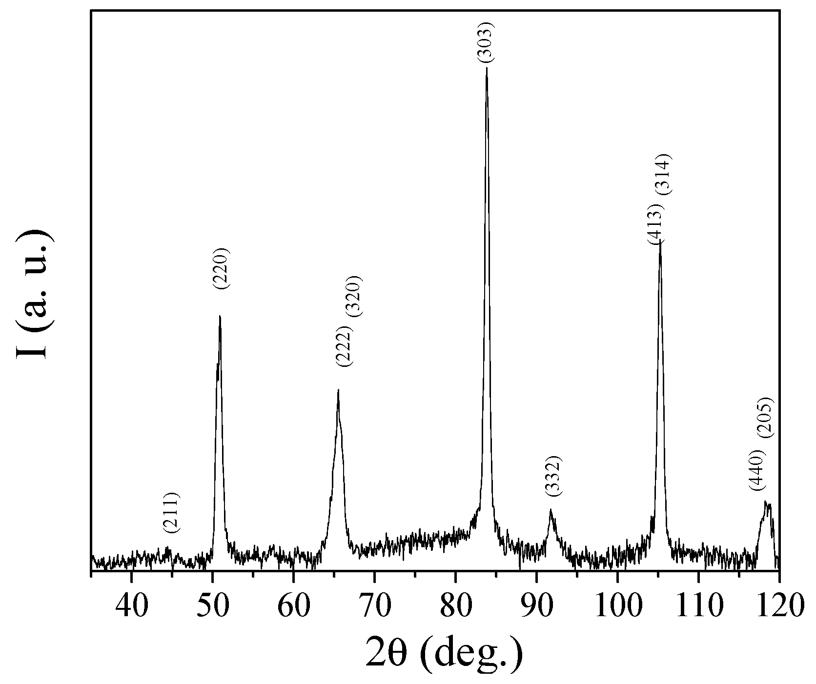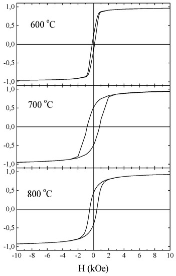 This evaluation gives us an average grain size, Dg ≈ 16 nm. Therefore, we must assume that Fe73.8Cu1Nb3.1Si13B9.1 microwire displays a lower coercivity (Figure 4b) because the nanocrystallization in this as-prepared sample is directly achieved (without a previous annealing).