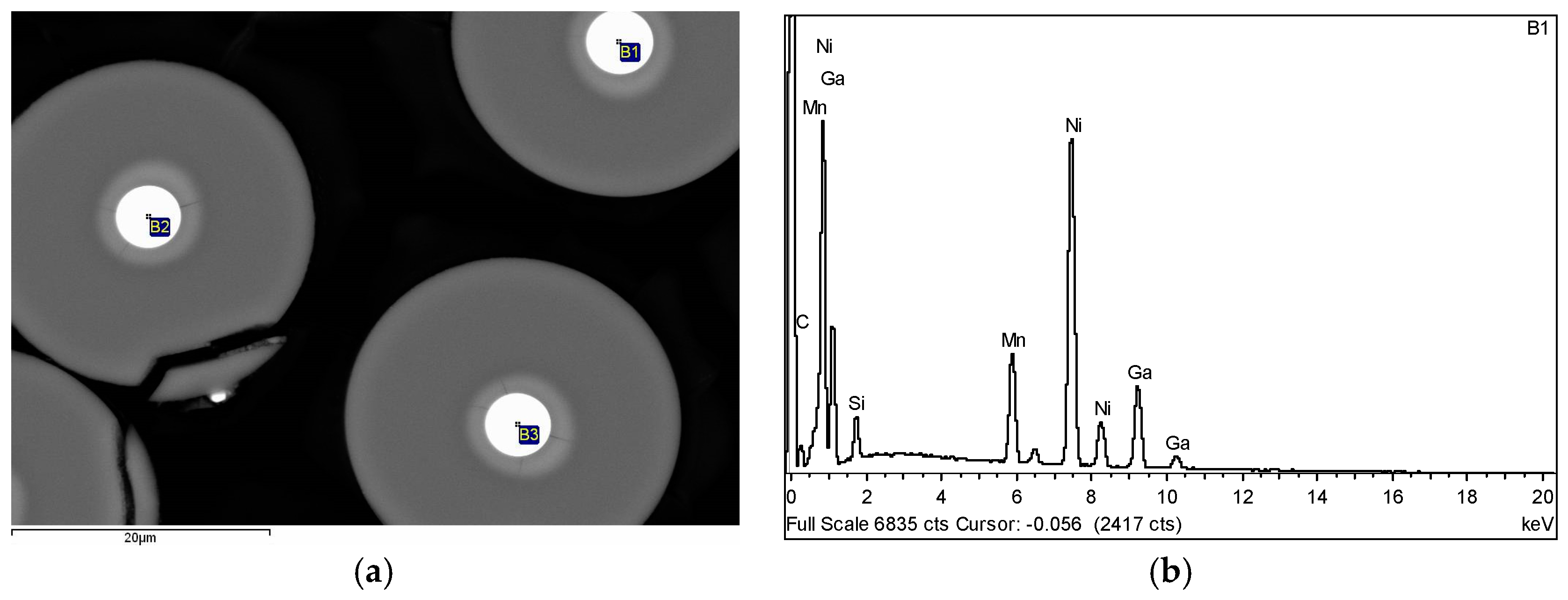 - Aronin, A.S.; Abrosimova, G.E.; Kiselev, A.P.; Zhukova, V.; Varga, R.; Zhukov, A. The effect of mechanical stress on Ni63.8Mn11.1Ga25.1 microwire crystalline structure and properties. Intermetallics 2013, 43, 60–64. [Google Scholar] [CrossRef]