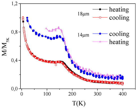 As mentioned above, nanocrystalline microwires can be obtained after crystallization of initially amorphous microwires by adequate heat treatments or in as-prepared state if the employed quenching rate is not high enough for preparation of amorphous microwires [41,42,43,44,45,46,47]. In latter cases, the composition of metallic nucleus is different from the one of amorphous magnetically soft microwires, and the structure is usually polycrystalline or granular. In some cases, after the recrystallization of the amorphous precursor, a magnetically semi-hard glass coated microwires can be obtained [43,48].