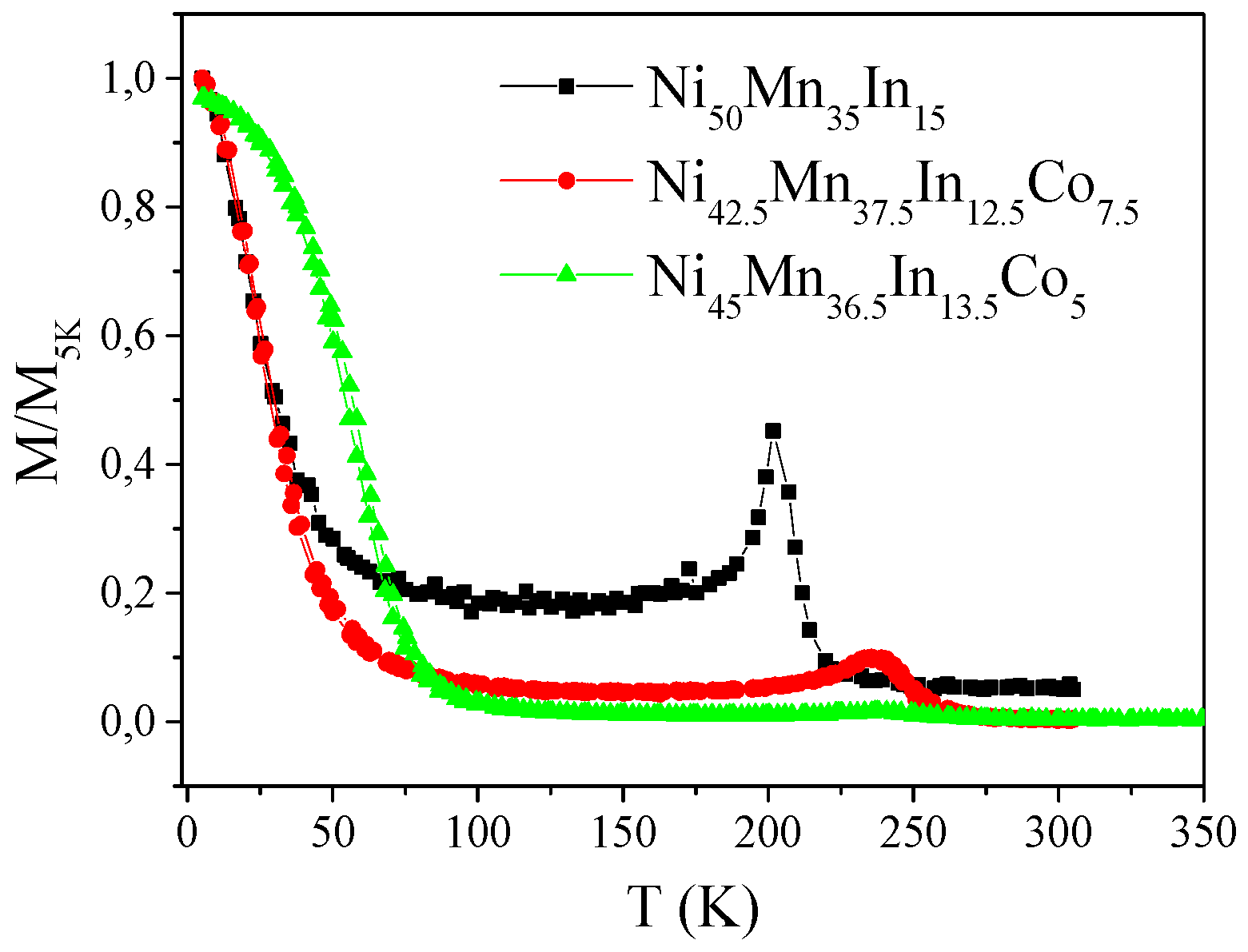 On the other hand, MSM alloys gained special importance within last few years owing to significant magnetic-field-induced strain (MFIS) originated from the coupling between magnetic and structural ordering. Such strain arises through the magnetic-field-induced motion of twin boundaries [30,31,32]. The coupling between magnetic and structural ordering in conjunction with magnetic and structural phase transformations give rise to further functional properties: MCE, magnetic-field-induced martensitic transformation, GMR, and electric polarization [30,31].