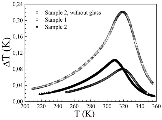 - Dubenko, I.; Samanta, T.; Quetz, A.; Kazakov, A.; Rodionov, I.; Mettus, D.; Prudnikov, V.; Stadler, S.; Adams, P.; Prestigiacomo, J.; et al. The comparison of direct and indirect methods for determining the magnetocaloric parameters in the Heusler alloy Ni50Mn34.8In14.2B. Appl. Phys. Lett. 2012, 100, 192402. [Google Scholar] [CrossRef]