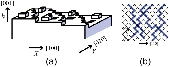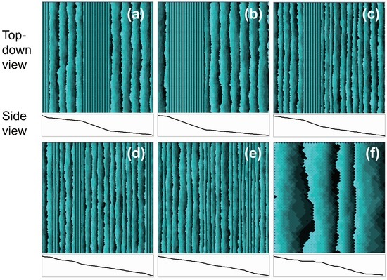 The explicit procedure of the application of the Monte Carlo method in this study is as follows. At the initial time, the steps are positioned at equal distances. Then, the lattice site to be updated is randomly selected. The surface structure is updated non-conservatively using the Monte Carlo method with the Metropolis algorithm. With the RSOS restriction taken into consideration, the structure is updated with probability 1 when and with probability when , where , is the energy of the present configuration and is the energy of the updated configuration. The energy is calculated from the Hamiltonian (Equation (6)). A periodic boundary condition was imposed in the direction parallel to the steps. In the direction normal to the steps, the lowest side of the structure was connected to the uppermost side by adding a height with a number of steps.