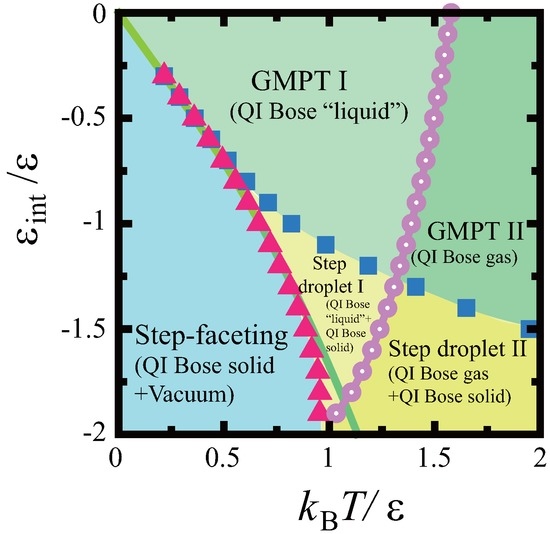 Faceting diagram of the p-RSOS model (RSOS model with point-contact-type step–step attraction) for a vicinal surface obtained using the density matrix renormalization group (DMRG) method. Squares: calculated values of . Triangles: calculated values of . Open circles: calculated roughening transition temperatures of the (001) surface. Solid line: zone boundary line calculated using the two-dimensional Ising model. For the definitions of and details about the QI Bose solid, liquid, and gas, please refer to Akutsu [43]. This figure was reproduced from Akutsu [43]. GMPT: Gruber–Mullins–Pokrovsky–Talapov.
