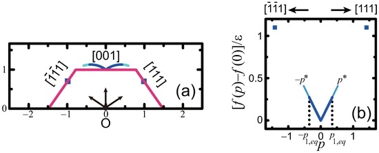 At equilibrium, the terrace surface with a slope of , which was calculated using the DMRG method, coexists with the (111) surface, which forms the side surface of the macrostep. For , can be obtained from Equation (14) using the value of z. In the same manner as for z, the curve of best fit was obtained for on a system of size as . In this manner, it was found that increases linearly with for small . Equation (13) with is plotted in Figure 3b as blue lines.