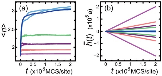 (a) Time evolution of the average number of steps in a merged step; (b) Time evolution of the average surface height . . Dark blue lines: . Light blue lines: . Green lines . Purple lines: . Coral lines: . Pink lines: . System size: , , .