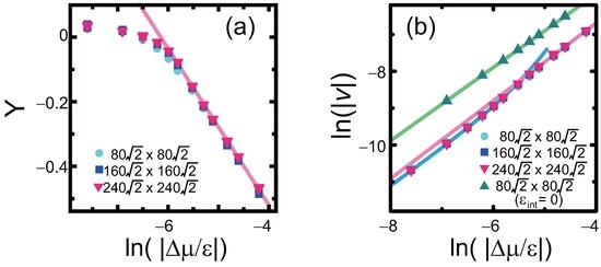 As shown in Figure 7, is not a roughening transition point in the Kosterlitz–Thouless universality class [71,72,73,74], but a crossover point from the two-surface coexistence state to a homogeneous rough surface. To clearly observe this crossover, the case with and —which is also in step droplet zone I—was calculated (Figure 8). In this case, and v showed behaviors quite similar to the case of and . In the case of , was obtained. The shift from the power law behavior for v at small in the case of was more evident than in the case of .