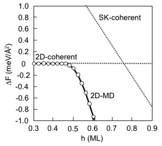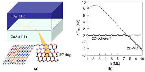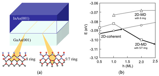 - Kaida, R.; Akiyama, T.; Nakamura, K.; Ito, T. Theoretical study for misfit dislocation formation at InAs/GaAs(001) interface. J. Cryst. Growth 2016. [Google Scholar] [CrossRef]