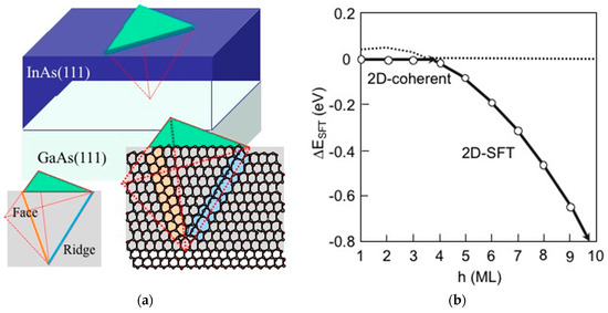 - Joe, H.; Akiyama, T.; Nakamura, K.; Kanisawa, K.; Ito, T. An empirical potential approach to the structural stability of InAs stacking-fault tetrahedron in InAs/GaAs(111). J. Cryst. Growth 2007, 301–302, 837–840. [Google Scholar] [CrossRef]