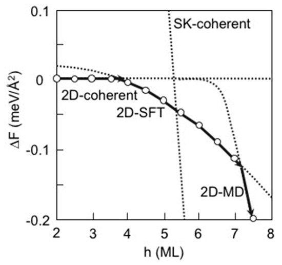 - Patella, F.; Nufris, S.; Arciprete, F.; Fanfoni, M.; Placidi, E.; Segarlata, A.; Balzarotti, A. Tracing the two- to three-dimensional transition in the InAs/GaAs(001) heteroepitaxial growth. Phys. Rev. B 2003, 67, 205308. [Google Scholar] [CrossRef]