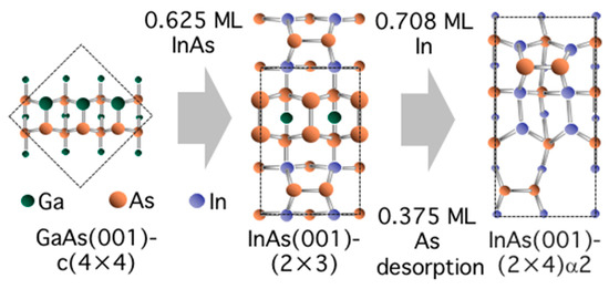 - Ito, T.; Akiyama, T.; Nakamura, K. Ab initio-based approach to structural change in InAs(001)-(2 × 3) wetting layer surfaces during MBE growth. e-J. Surf. Sci. Nanotechnol. 2015, 13, 190–194. [Google Scholar] [CrossRef]