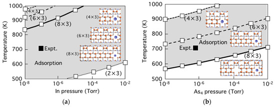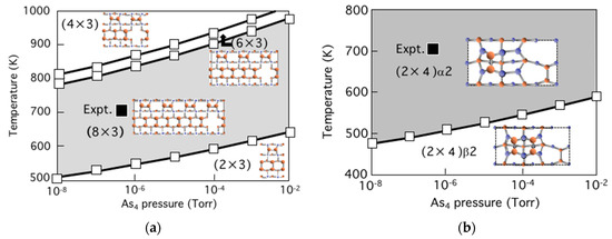 - Ito, T.; Nakamura, T.; Akiyama, T.; Nakamura, K. An ab initio-based approach to phase diagram calculations for GaAs(001)-(2 × 4)γ surfaces. Appl. Surf. Sci. 2008, 254, 7663–7667. [Google Scholar] [CrossRef]