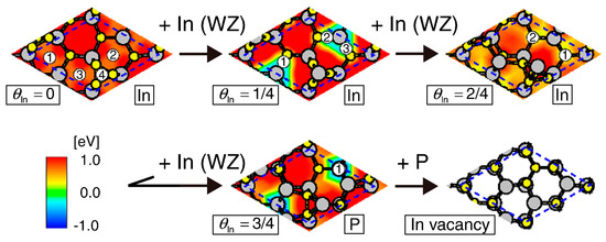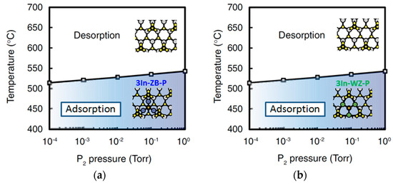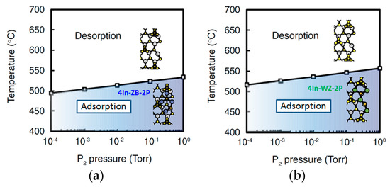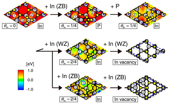 - Yamashita, T.; Akiyama, T.; Nakamura, K.; Ito, T. Theoretical investigation of effect of side facets on adsorption–desorption behaviors of In and P atoms at top layers in InP nanowires. Jpn. J. Appl. Phys. 2011, 50, 55001. [Google Scholar] [CrossRef]