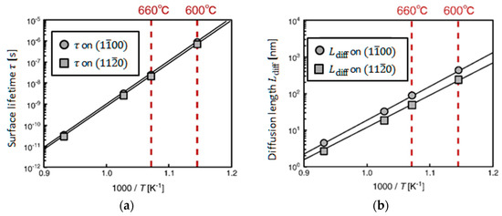 | Surface Orientation | τ (×10−7 s) | Ldiff (×102 nm) | Migration Barrier (eV) |