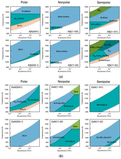 - Akiyama, T.; Nakamura, K.; Ito, T. Stability of hydrogen on nonpolar and semipolar nitride surfaces: Role of surface orientation. J. Cryst. Growth 2011, 318, 79–83. [Google Scholar] [CrossRef]