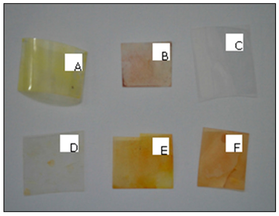 PS films modified with different aminocompounds: aniline (A); 3-aminophenol (B); 4-aminophenol (C); 2-chloroaniline (D); o-toluidine (E) y 4-nitroaniline (F).