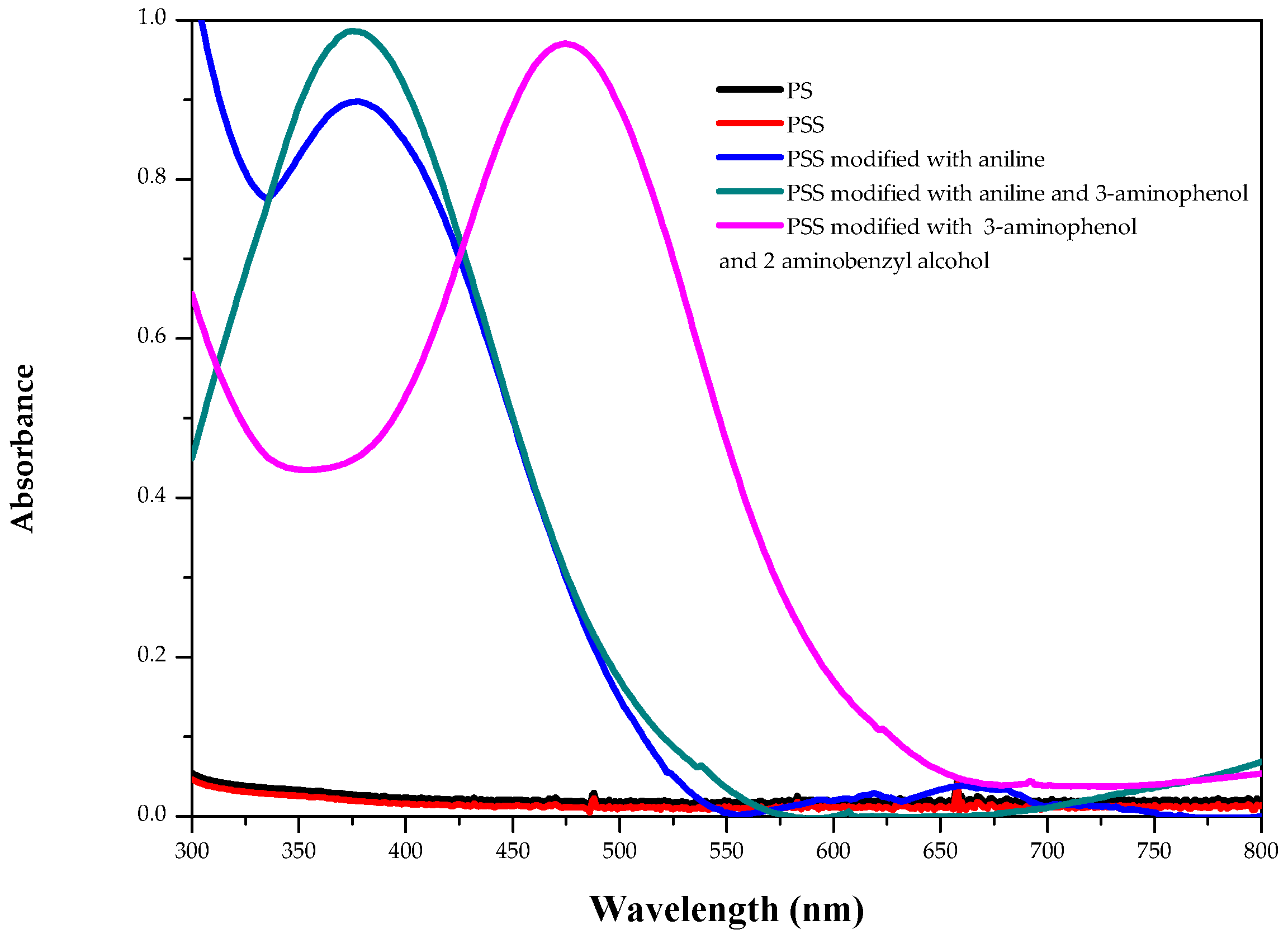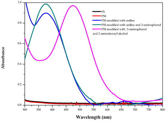 As we can observe in Figure 2, the UV-vis spectra of PS and PSS films do not present any band in this region. The absorbance values of the spectra depend of the modification level; for this reason, the PSS modified with aniline and 3-aminophenol, and PSS modified with aniline present different absorbance values at similar wavelength. However, the wavelength of each band depends on the conjugation level. Therefore, UV-vis spectral measurements provide evidence for the surface chemical modification of films. Thus, the PSS modified with aniline shows an excitation wavelength band at 375 nm; the PSS modified with aniline and 3-aminophenol presents a band at 375 nm; and the PSS modified with 3-aminophenol and 2-aminobenzylalcohol also presents a band at 480 nm. The excitation bands between 300 and 450 nm have been assigned to π–π* transition in the azo groups. The band at 480 nm from the PSS modified with 3-aminophenol and 2-aminobenzyl alcohol could be due to the same transition red-shifted by conjugation with aromatic rings [56]. Moreover, Acevedo et al. demonstrated the modification of PS films using the same method [57]. Taking into account that Figure 1 clearly shows a visible change in the surface color in each PSS modified, the UV-vis spectroscopy presents the transition bands of the azo compound (Figure 2), and the published data by Acevedo et al., it is possible to ensure that the surface has been modified.