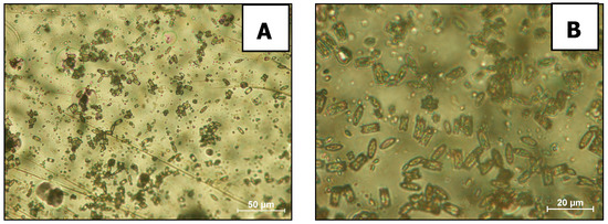Optical image of CaOx crystals grown in polystyrene films sulphonated and diazotated with aniline. Low at 40× (A) and high at 100× (B) magnifications.