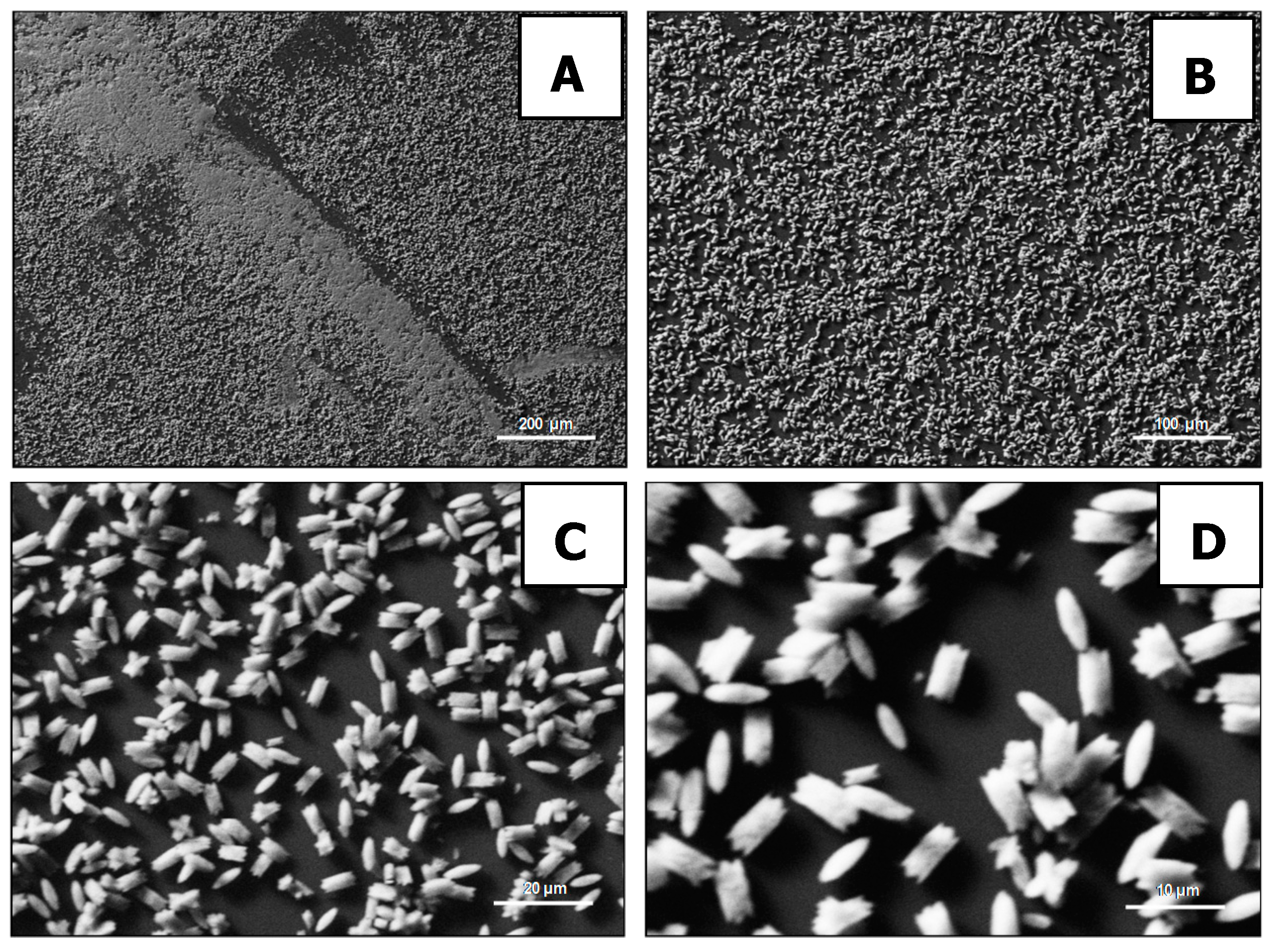SEM images of CaOx crystals grown on PS films sulphonated and diazotated with 2-trifluoromethyl aniline. Low (A,B) and high (C,D) magnifications.