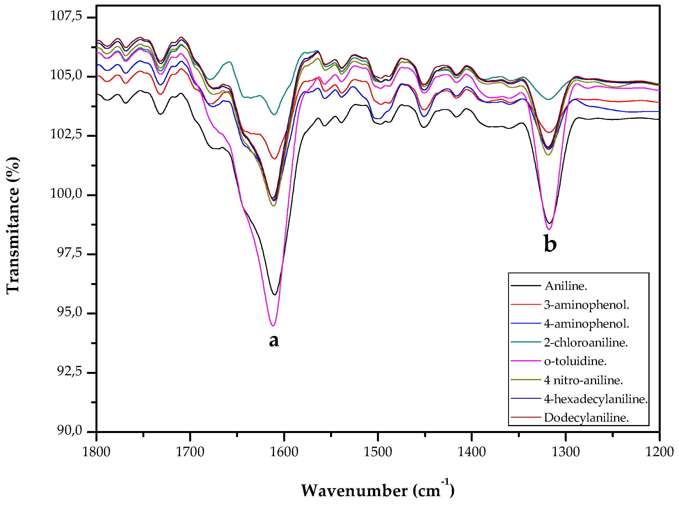 Fourier transform infrared spectroscopy (FTIR) spectra of CaOx crystals grown on sulphonated PS films, and diazotated with aniline, 3-aminophenol, 4-aminophenol, 2-chloroaniline, o-toluidine, 4-nitroaniline, 4-hexadecylaniline and dodecylaniline.