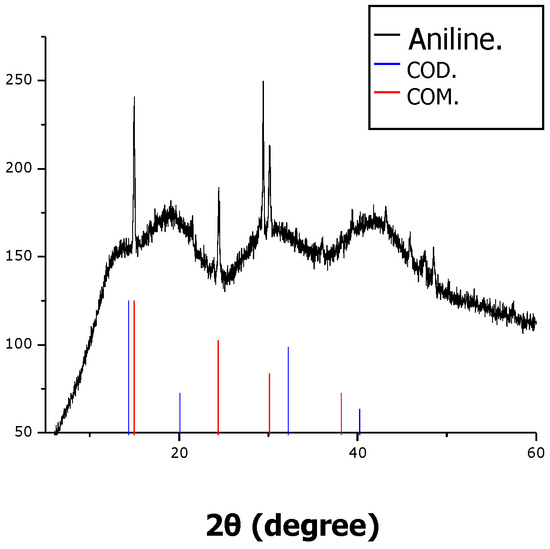 Complementing this study, a series of XRD measurement of CaOx grown on DSPF were also performed. XRD has advantages of reliability in qualitative analysis, and accuracy in quantitative analysis; being the choice test for the determination of crystal types in HKS [69,70]. In Figure 6, it is possible to observe diffraction peaks that are attributable to both COD as COM crystals. However, more intense peaks, detected at 2θ, such as 15°, 25°, 30° and 31°, correspond to crystal planes {1 0 1}, {2 1 1}, {2 0 2} and {0 2 0} of COM crystals respectively, which confirm what is observed by the above analysis [43,71,72,73,74]. In general, the use of this kind of functionalized DSPF film as a solid organic template could contribute to understanding the mechanisms underlying the formation of biologically important minerals, such as pathological urinary crystal forms, and it is kinetic on surface deposition. Moreover, an extra evaluation of the effect of the constituent ions’ ratio, ionic strength, pH, presence of relevant inorganic ions, concentration and/or biological activity of macromolecules, supersaturation, and temperature found in urine, represents an advanced approach to test natural and/or synthetic additives with inhibiting and/or preventive properties of HKS formation. The current polymer surface approach is also important to the pharmaceutical industry.