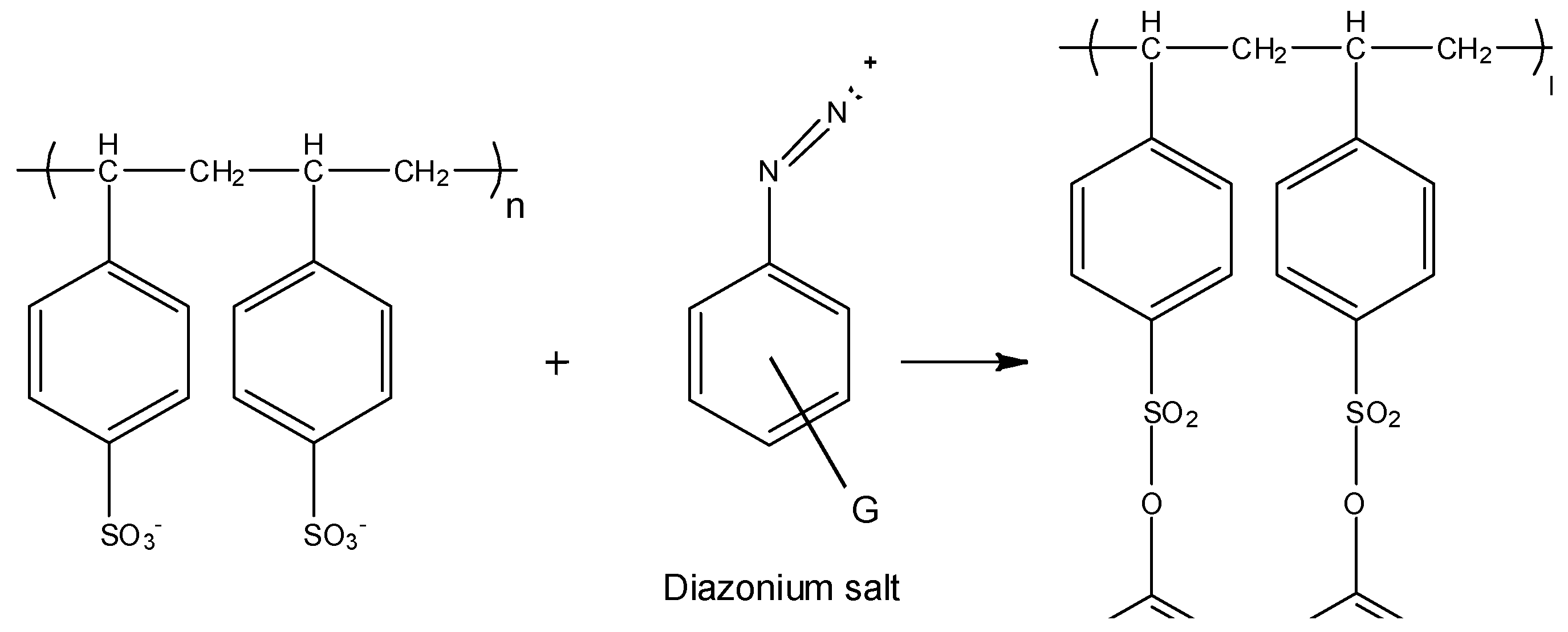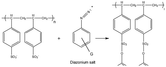 Reaction scheme between polystyrene and diazonium salt with G as a substituent group.