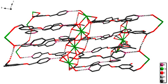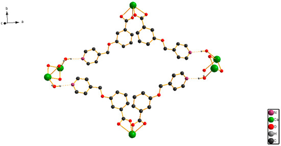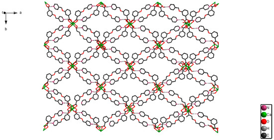 The X-ray single-crystal structural analysis revealed that [CaL2(H2O)2]n crystallizes in monoclinic C2/c space group, and that the Ca(II) ion is surrounded by six O atoms from four 3,5-bis(4-pyridylmethoxy)benzoate ligands and two O atoms from two coordinated H2O molecules (Figure 1). The Figure 1 displays that the eight-coordination Ca(II) ion forms a distorted square-antiprismatic CaO8 polyhedron. The 3,5-bis(4-pyridylmethoxy)benzoate ligand only uses its O atoms for coordinating, and its pyridyl nitrogens do not coordinate to Ca(II) ion, which is different from the Zn(II), Ni(II), and Cd(II) complex with 3,5-bis(4-pyridylmethoxy)benzoate ligand [21,22,23,24,25]. The pyridyl rings have dihedral angles of 24.0° (C9–C10–C11–N1–C12–C13) and 19.2° (C15–C16–C17–N2–C18–C19) with phenyl ring (C2–C3–C4–C5–C6–C7) in an L ligand. [CaL2(H2O)2]n forms a 2D layered structure by O–H···N hydrogen bonds (Figure 2). Meanwhile, a looped structure and 3D supramolecular network structure have formed by O–H···N hydrogen bonds (Figure 3 and Figure 4). The selected bond lengths and bond angles for [CaL2(H2O)2]n are listed in Table 1.