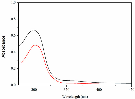 The UV-Vis spectra of 3,5-bis(4-pyridylmethoxy)benzoic acid (HL) and [CaL2(H2O)2]n·HL ligand (red) and Ca(II) complex (black).