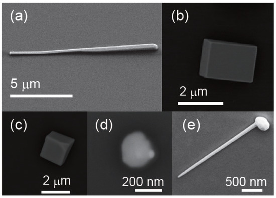 We investigated the possibility to control the dimensions of nanostructures by the use of various diameters of GNPs in our high-temperature VTG method. In this report, we will focus on the results from the use of 20- and 50-nm GNPs. It should be noted that a similar correlation between the diameter of GNPs and the dimensions of the smallest nanostructures was found in this work. For example, a nanoneedle shown in Figure 1e is one of the smallest nanostructures grown by the use of 20-nm GNPs. However, nanostructures as small as that shown in Figure 1e could not be observed among samples grown either by the use of 50-nm GNPs (e.g., Figure 1c,d) or without GNPs (e.g., Figure 1a,b). Obviously, further statistical studies are necessary in order to quantify the size effect of GNPs on the control of the dimensions of In-SnTe nanostructures.