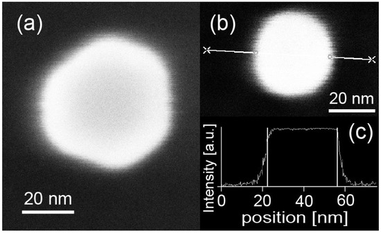 Scanning electron microscope topography of (a) a typical 50-nm GNP dispersed from the gold colloidal solution on a Si substrate before heating and (b) one of the same GNPs after heating at 610 C. (c) Line profile of the intensity of secondary electrons in (b). Scale bar in (b,c) is 20 nm.