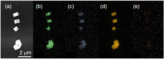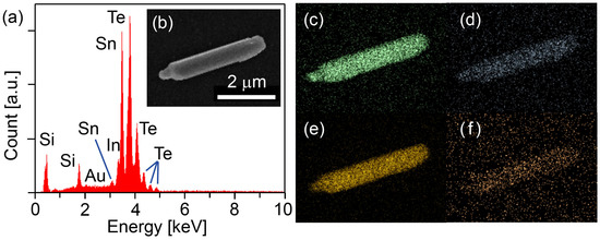 Figure 3a shows EDX spectra taken from a point analysis at the middle of one of the typical In-SnTe nanostructures (nanorod) grown under the V–L–S mechanism with the use of 20-nm GNPs on a silicon substrate. The inset (Figure 3b) in Figure 3a presents a SEM topography of the nanorod sample. EDX elemental analyses with respect to Sn, In, Te, and Au for the same sample in Figure 3b are mapped in Figure 3c–f, respectively. The amount of Au estimated from the volume of a ∼20-nm GNP and that of the sample is the order of at most 0.1 atomic percent (at. % or at%), which is consistent with an expected detection limit of EDX spectroscopy. The observation of a tiny Au peak in Figure 3a and Figure S1a in the Supplementary Materials indicate the fact that the amount of one ∼20-nm GNP is detectable using our EDX.