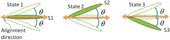 Top view to illustrate the FLC molecule orientation, state 1 represents the no-applied-electric-field state, state 2 and 3 represent the two different states with different electric field polarities.