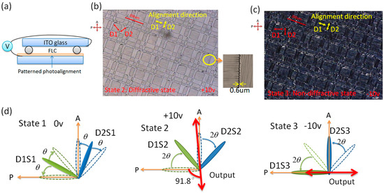(a) Structure of the prepared FLC DG; (b) Microscopic photo of the ESH-FLC DG in the diffractive state under crossed polarizer and analyzer; (c) Microscopic photo of the ESH-FLC DG in the non-diffractive state under crossed polarizer and analyzer; (d) Illustration of the molecule orientation and output light polarization after the FLC cell in different states for the two domains.