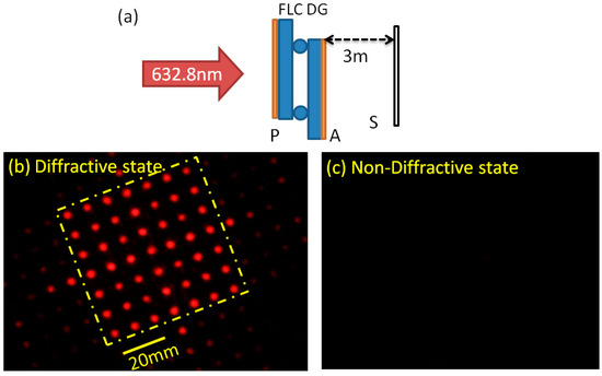 To measure the diffractive performance of the FLC DG, the optical setup shown in Figure 3a is used, in which a He-Ne laser with wavelength 632.8 nm is used to pass through the prepared FLC DG, and the polarizer (P) and analyzer (A) are set on the two side of the DG with the same configuration as shown in Figure 2. A signal generator is used to apply electric field on two ITO substrates of the DG. By switching the electric field polarity between +10 V and −10 V, the grating will show switch between diffractive state and non-diffractive state. A screen (S) is used to collect the diffraction patterns for the two states which are shown in Figure 3b,c. It can be seen that in the diffractive state a 7 × 7 diffractive orders (in dashed yellow square) is generated as shown in Figure 3b, and a dark non-diffractive state is shown in Figure 3c. The optical phenomenon consists with the above theoretical analysis.
