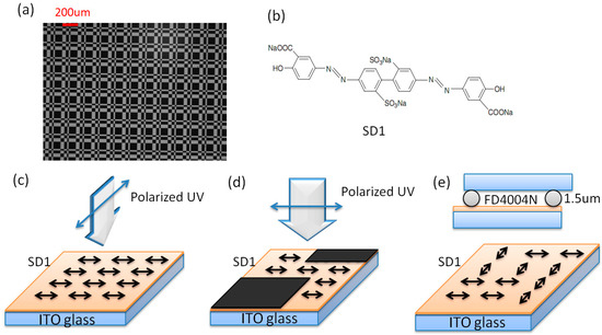 To fabricate LC DGs, it is necessary to have well designed structures, which are normally defined by the transition points between different phase (0, pi) domains. Since there are lots of well-designed DG phase structures in previous studies, we directly applied the grating structures from reference [36]. Based on the structures, a chrome mask (photos shown in Figure 4a) is fabricated, in which the different phase domains are either opaque or transparent. To transfer the domain structure in the mask to the LC device, the photoalignment material azo-dye SD1 (chemical structure shown in Figure 4b) is used. The SD1 has two important properties [7]: first, when SD1 layer is exposed with linearly polarized UV or blue light, the LC molecules will be aligned along the direction perpendicular to the exposure light polarization; second, the alignment direction of SD1 is able to be realigned so its alignment direction will follow the latest exposure. By applying these two alignment properties of SD1, a two-step exposure is used to generate a patterned DG alignment structure. The SD1 material is first dissolved in solvent Dimethylformamide (DMF) in 0.5%, and then, the solution is spin-coated on a cleaned ITO glass substrate. After baking for evaporating the DMF solvent, the substrate is then exposed under polarized UV light to generate the first alignment direction, as shown in Figure 4c. In the second step exposure, the prepared DG chrome mask is placed contacting with the SD1 substrate, which is then exposed again under polarized UV light but in the perpendicular polarized direction comparing with the first exposure, as shown in Figure 4d. In the second step exposure, only the area that is not blocked by the chrome mask is exposed, within which the alignment direction is changed to be perpendicular relating to the first direction. With these two step exposure, a patterned alignment structure with two orthogonal aligned directions is created. Then a LC cell is assembled with the prepared patterned aligned substrate as one side of the cell and another ITO glass substrate without alignment layer as the other side, as shown in Figure 4e. The 1.5 μm spacers are deposited between the two substrates to control the cell gap. Then a FLC material FD4004N (Dainippon Ink & Chem Inc., Saitama, Japan) is filled into the prepared LC cell, so the FLC DG is fabricated.