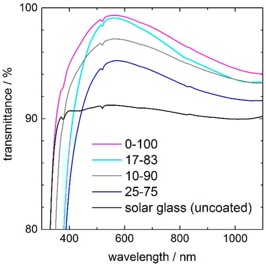 Solar cover glasses for solar thermal applications prevent convection and radiation losses of the solar collector, and are used for thermal insulation of the solar receiver []. A drawback of any cover material is the loss of the incident sunlight by reflection at the surfaces of the cover sheet. Therefore, antireflective (AR) coatings (e.g., from porous silica) are applied to minimize reflection losses (e.g., see [,,,]). However, a decrease in solar transmittance, which means a decreased efficiency of the solar collector, is also caused by contaminants like volatile organic carbons or biofouling products at the surface of the cover glasses. The most investigated photocatalyst, which can oxidize and decompose organic and inorganic contaminants, is titania in the anatase modification. For solar applications, several multilayer systems with antireflective (AR) and antifouling (AF) properties, containing titania, have been investigated [,,,,,,], and a bifunctional AR and AF single layer from dispersed TiO2 in a silica matrix has also been studied [].