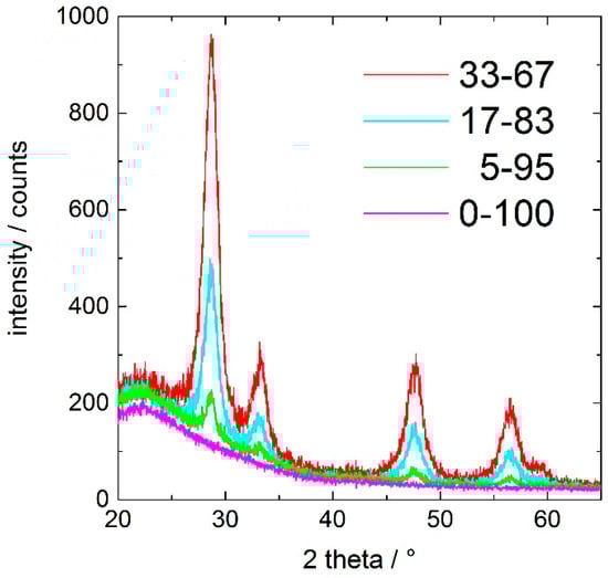 Figure 2 shows the X-ray-diffraction pattern of the ceria-containing silica coatings after curing at 350 °C for 60 min. The peaks corresponding to the (111), (200), (220), and (311) planes of fluorite structured cubic ceria at approximately 28°, 33°, 47°, and 57° 2θ (PDF card 98-019-2224) are clearly identified. The fraction of crystalline ceria is increasing with increasing cerium content in the coating.