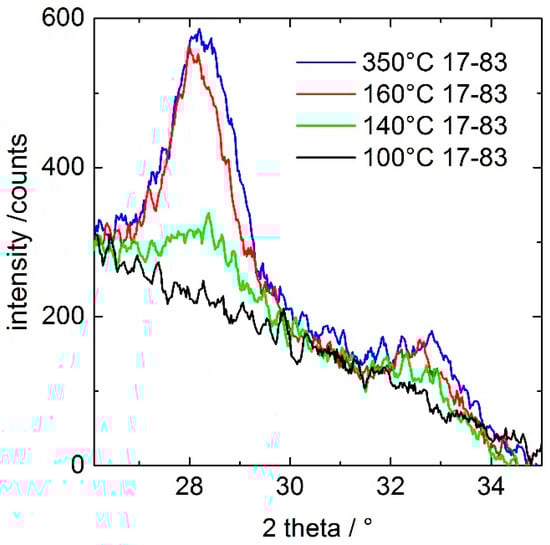 Evolution of the (111) and (200) diffraction peaks of cubic ceria (at approximately 28° and 33° 2θ) during in situ GIXRD in a high-temperature chamber heated at 10 K/min from room temperature up to 350 °C.