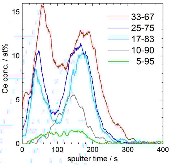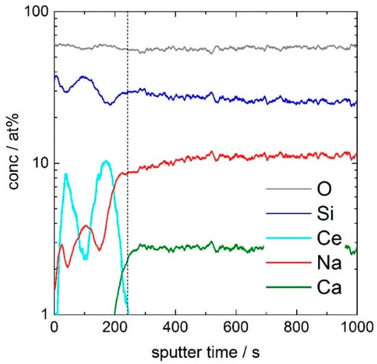 Figure 4 shows the concentration depth profiles of oxygen (O), silicon (Si), cerium (Ce), sodium (Na), and calcium (Ca) of the 17–83 coating. Whereas the sputter rate for the glass substrate is 0.3 nm·s−1, the sputter rate for the porous layer is 0.5 nm·s−1. After a sputter time of 240 s, corresponding to 120 nm, the coating is removed. In order to reveal details of the minor fraction cerium, the concentration axis of Figure 4 is shown in logarithmic scales. For the depth profile of Ce, a double peak in the coating with maximum intensities at 50 s (25 nm) and 170 s (85 nm) and a minimum intensity at 110 s (55 nm) is evident. At the depth of the minimum of the Ce-double peak, silicon shows a maximum in the intensity, which indicates a CeO2/SiO2/CeO2-rich layered structure of the coating after curing at 350 °C for 60 min. This triple-layer structure consists of two ceria-rich layers, one at the coating/air interface, the other at the coating/glass interface, and a silica-rich layer between.