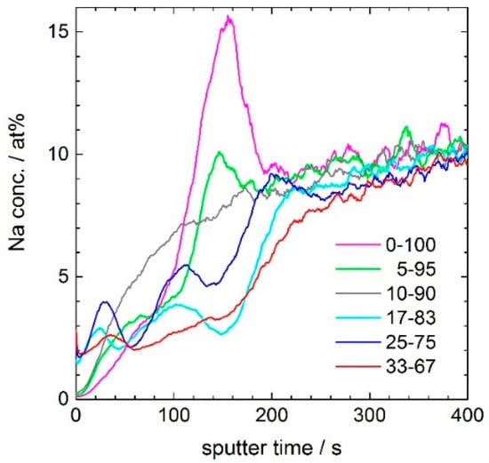 Figure 6 shows that the Na hump located at the second Ce maximum (close to 170 s sputter time, i.e., at 85 nm depth) is vanishing, and the average sodium concentration in the layer is decreasing with increasing ceria concentration of the coating. In the porous silica layer without ceria, the Na-enrichment is up to 16 atom %, in the 5–95 coating up to 10 atom %, and in the 17–83 coating Na shows a relative smooth depth dependence with a maximum value of less than 4 atom %. This development can be explained by the assumption that the diffusion of sodium ions from the glass substrate into the layer is blocked by ceria.